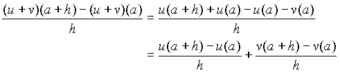 l’existence de u’(a) et v’(a), supposée ici, entraîne celle de (u + v)’(a), la valeur de ce nombre dérivé étant u’(a) + v’(a) (limite du premier quotient + limite du deuxième quotient) Remarques :