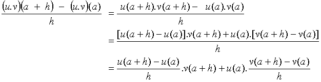 Sous l’hypothèse de l’existence de u’(a) et v’(a), les deux rapports ci-dessus tendent respectivement vers u’(a) et v’(a), alors que v(a + h) tend vers v(a) quand h tend vers 0. Ce qui montre que u.v est dérivable en a et que (u .v)’(a) = u’(a).v(a) + u(a).v’(a) |